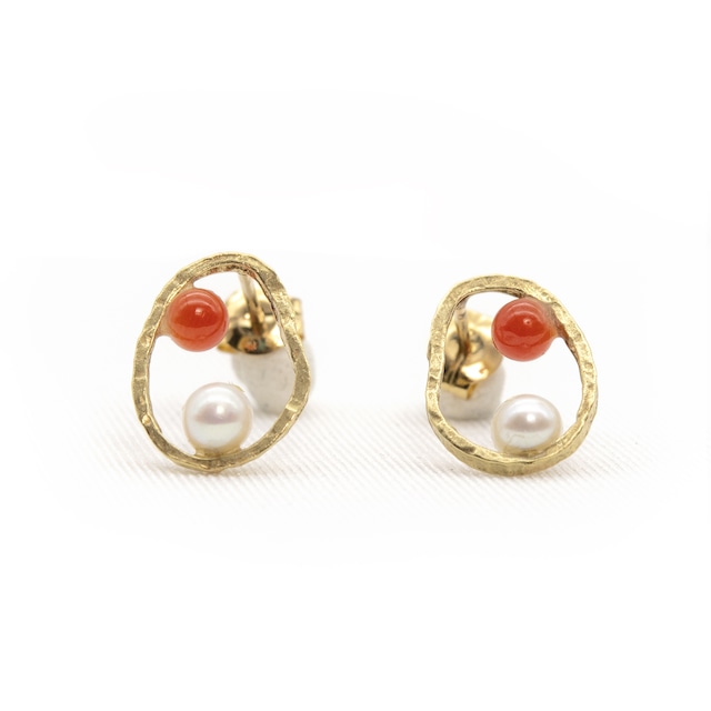 輪っか状のK18YGデザインに、赤珊瑚と淡水パールを加えたスタッドピアスです。